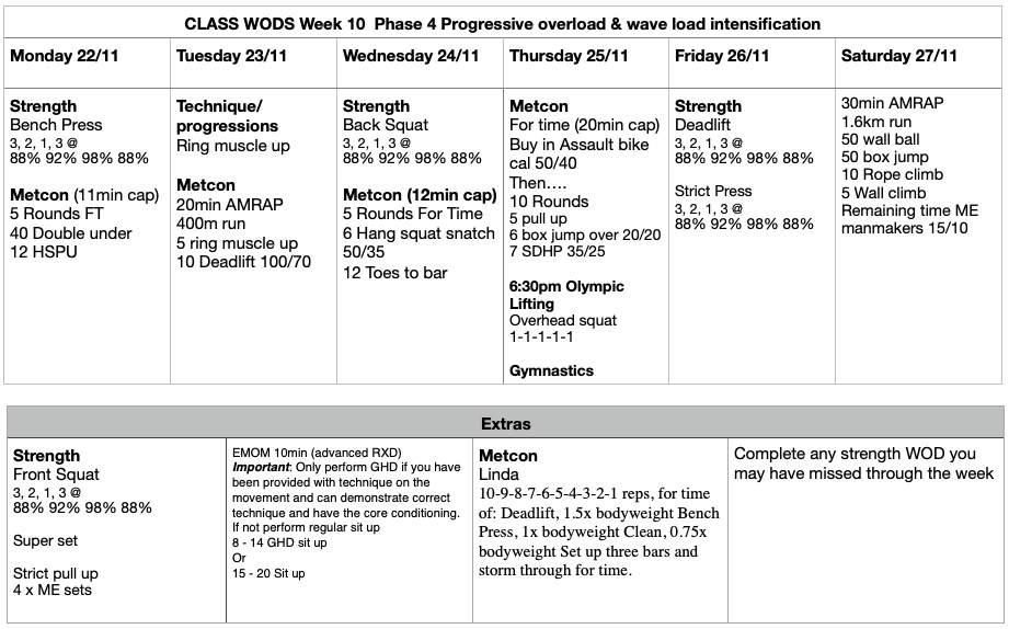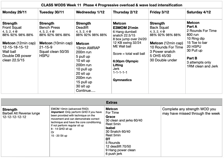 Ideally you should now know your 1RM on the core lifts of Bench Press, Back Squat, Deadlift, Front Squat. If you are new to CFC or yet to establish a 1RM have a chat to a coach to help you with this.