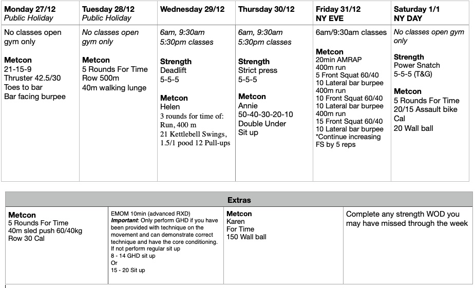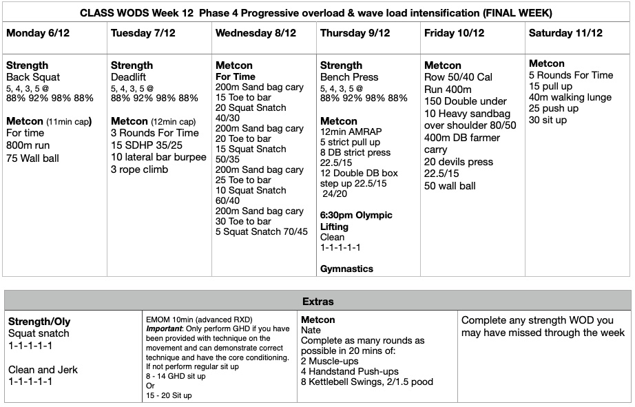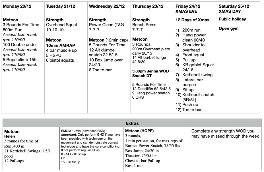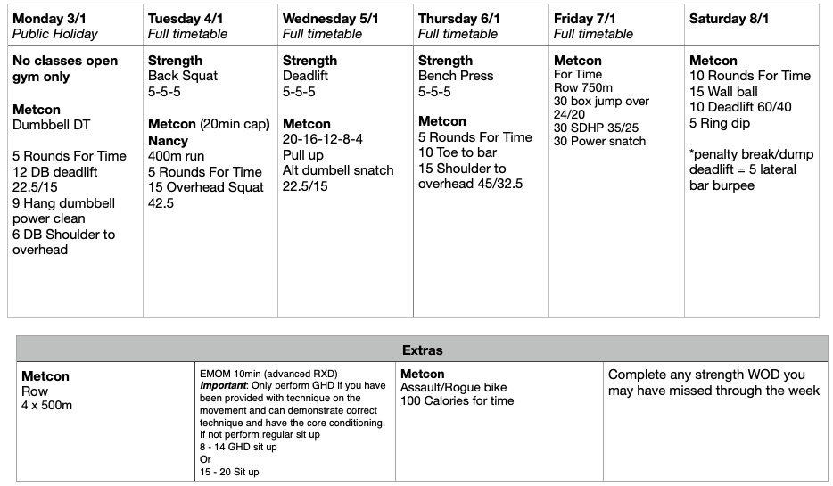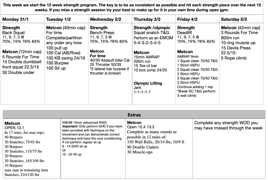This week we start the 12 week strength program. The key is to be as consistent as possible and hit each strength piece over the next 12 weeks. If you miss a strength session try your best to make up for it in your own time during open gym.