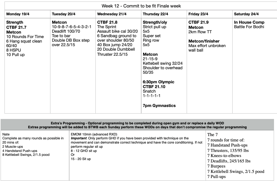 Week 12 April 18, 2021February 8, 2021 by Adm1n_Acc3ss, posted in Uncategorized Finale week of the commit to be fit 12 week challenge. Congratulation to everyone who have made a commitment to your fitness