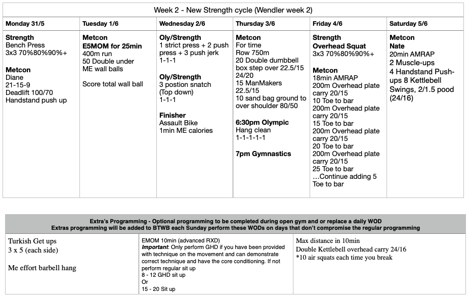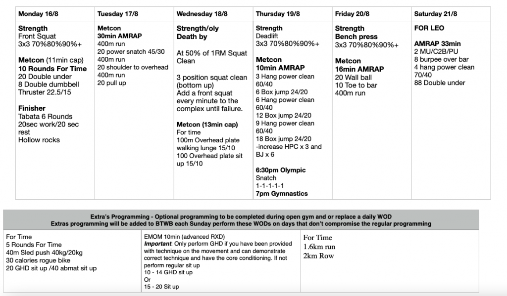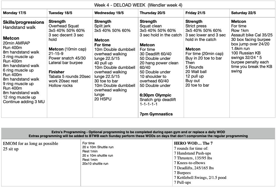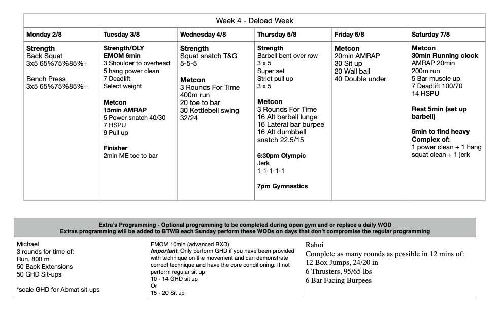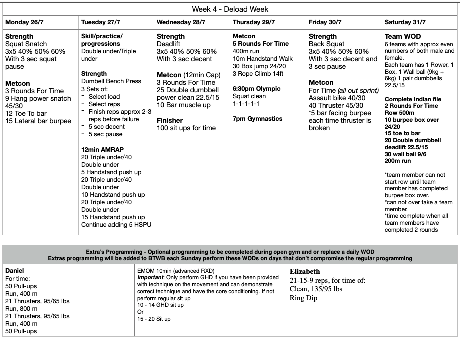 CrossFit Coorparoo – Weekly Programming July 25, 2021June 23, 2021 by Adm1n_Acc3ss, posted in Uncategorized Deload Week. Time to reduce the load and increase time under tension within our strength program