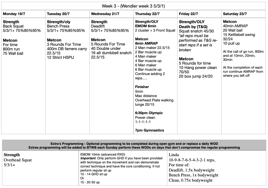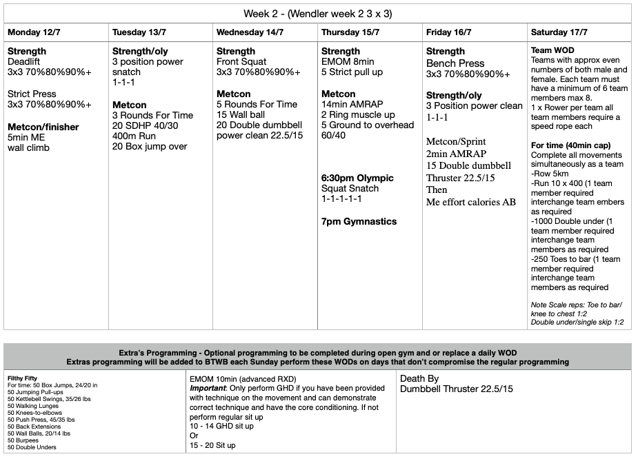 Weekly Programming 12/7 July 11, 2021June 22, 2021 by Adm1n_Acc3ss, posted in Uncategorized Week 2 of the Wendler strength cycle and a BIG FUN team WOD to finish off the week of training