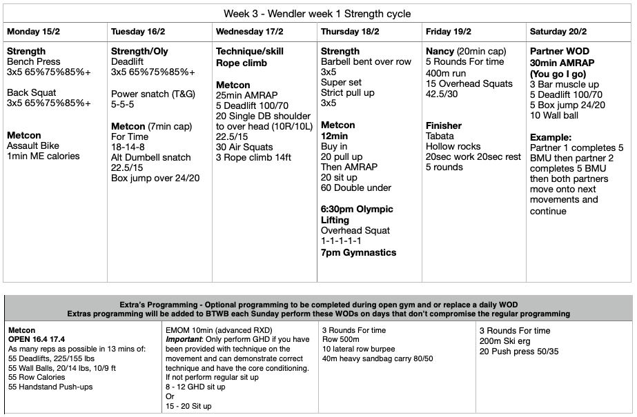 This week we move into week 3 wendler strength cycle 5/3/1. We are now into March and the open i just around the corner. Be sure to have a crack at an open WOD.