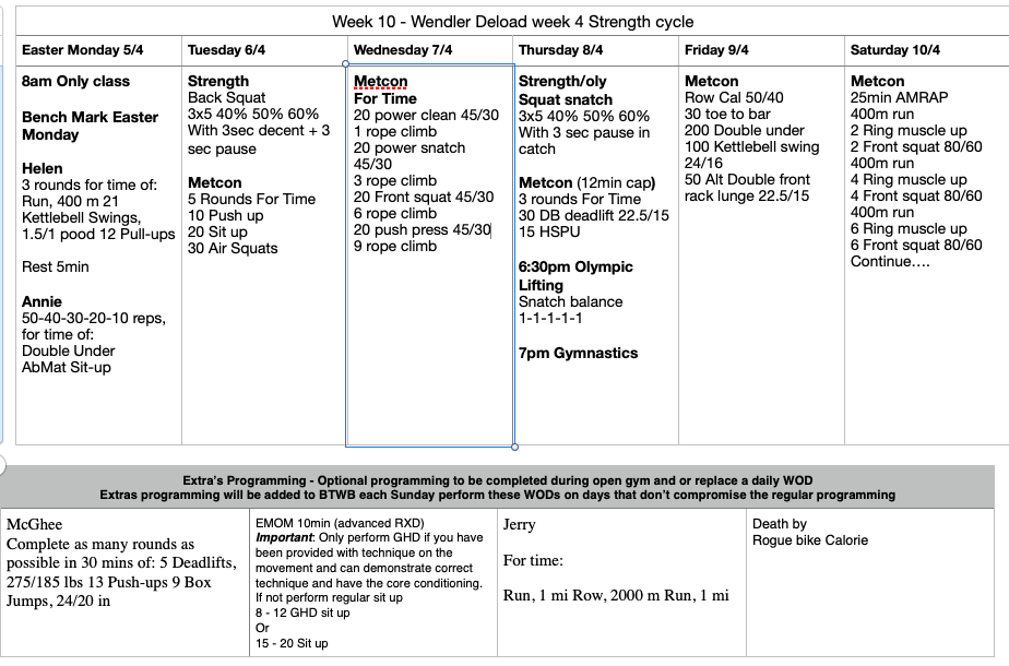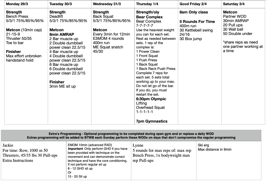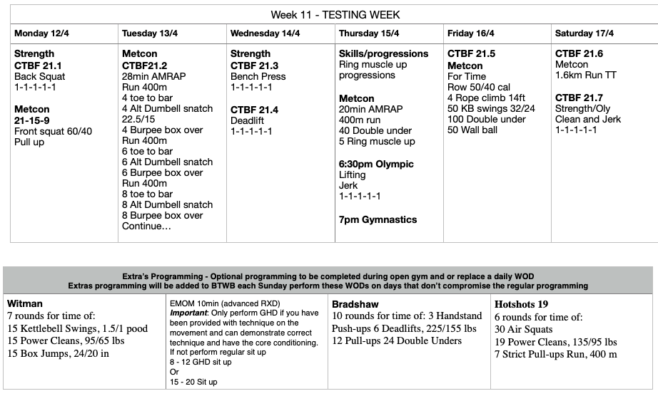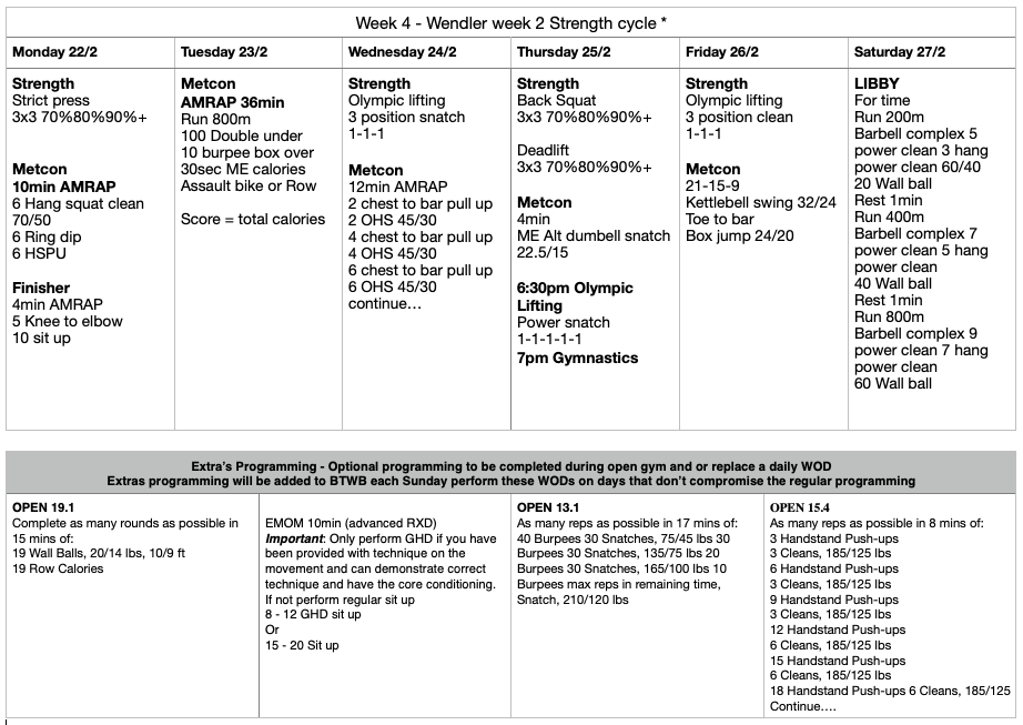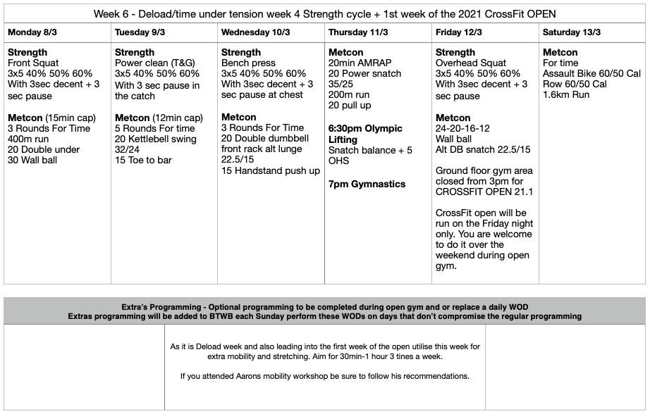 This week we start to see an increase in loads. Be sure to have a crack at some of the open WODs programmed in the extras programming. This will give you a good taste of what the up coming open will be like.