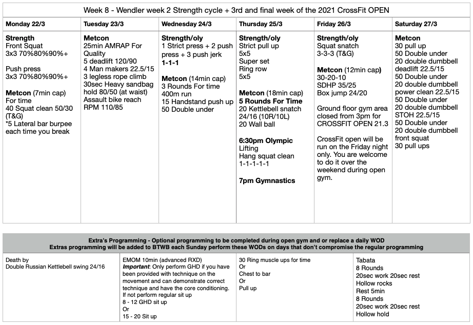 Week 8 – Wendler week 2 Strength cycle + 3rd and final week of the 2021 CrossFit OPEN. We have had some big weeks of training recently and this week will be no different. Be sure to keep you mobility and stretching as a priority