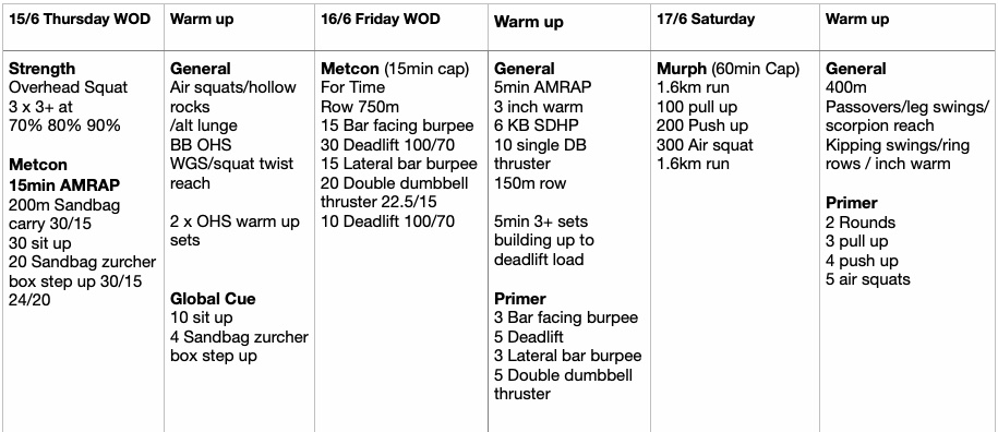 Bring cash and friends on the day and throw down with 3 hero WODs lead by coach Justin
