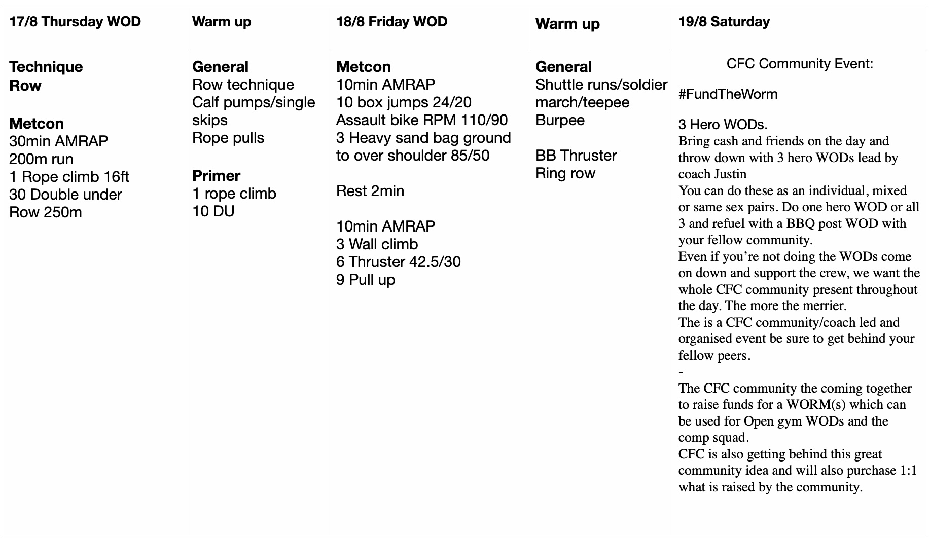 The CFC community the coming together to raise funds for a WORM(s) which can be used for Open gym WODs and the comp squad.