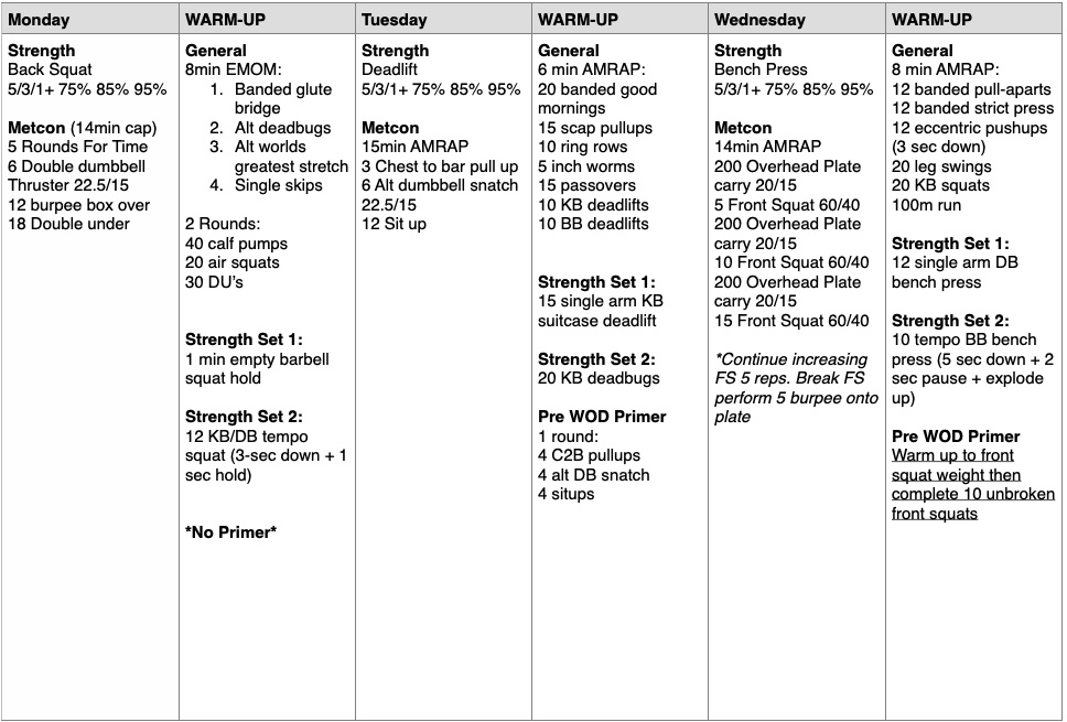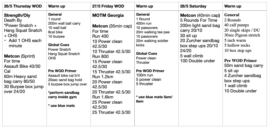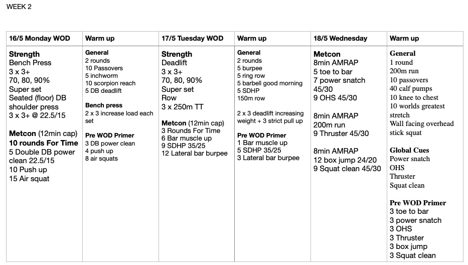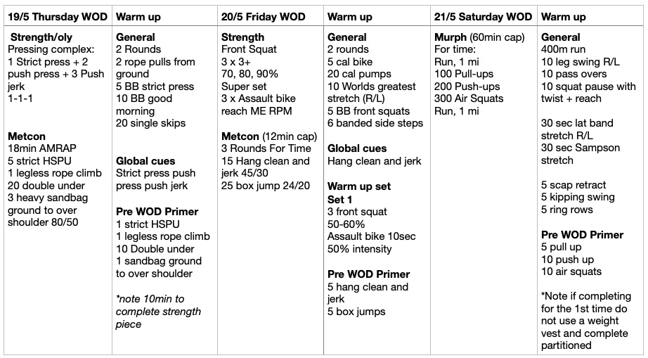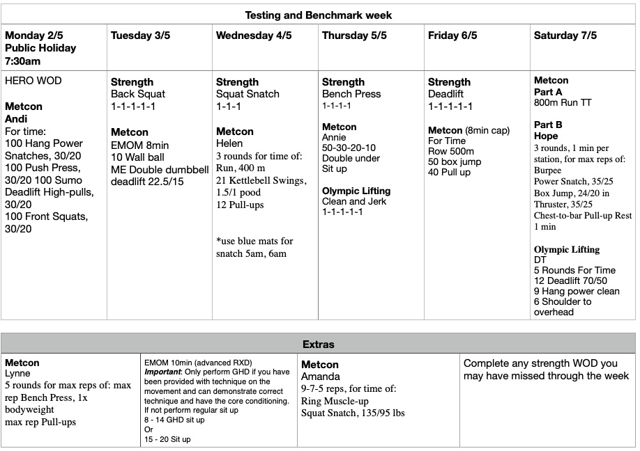 Weekly Programming May 1, 2022April 29, 2022 by Adm1n_Acc3ss, posted in Uncategorized Testing week is upon us. We start the week off with a public holiday Hero WOD before we test our 1RM lifts and bench mark WODs