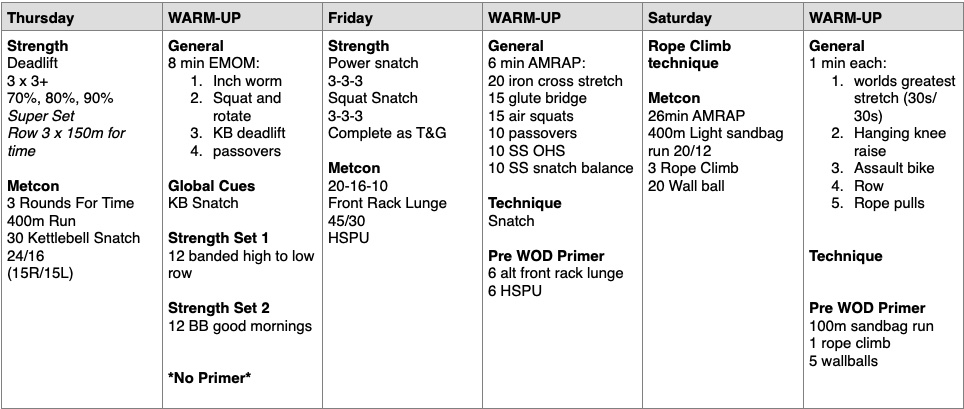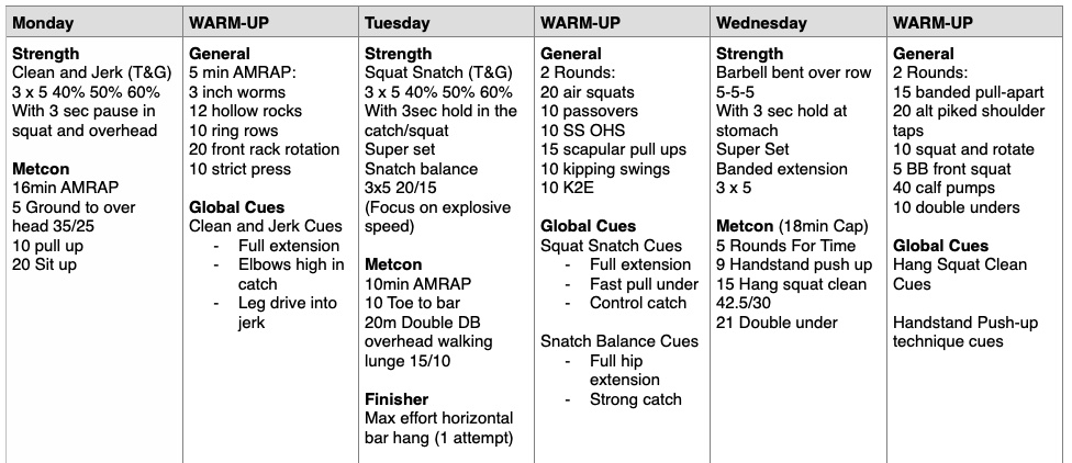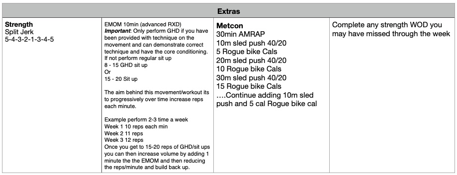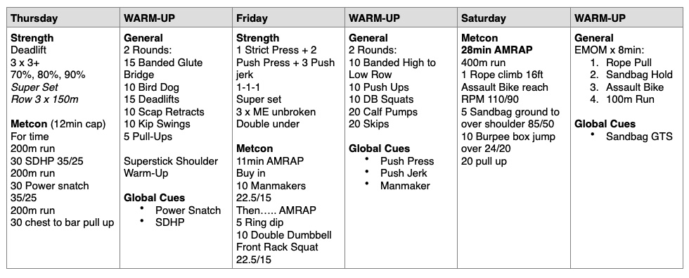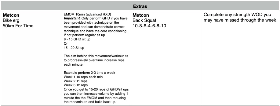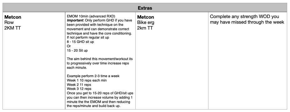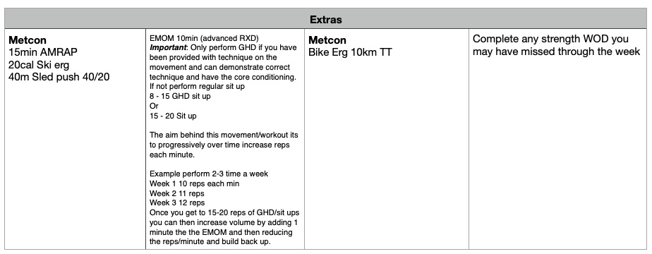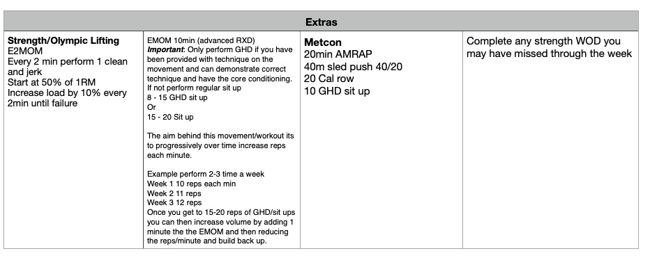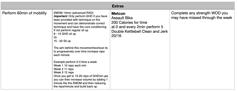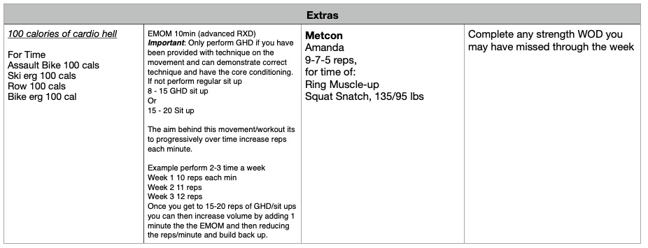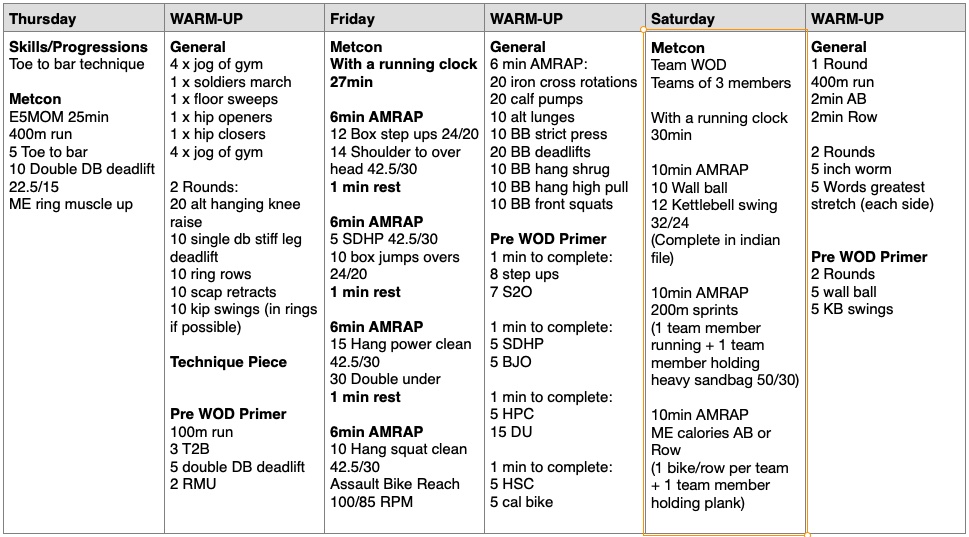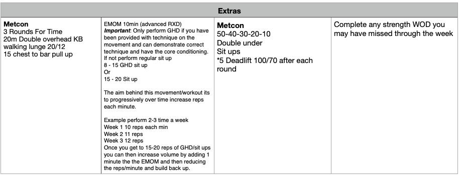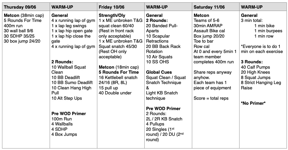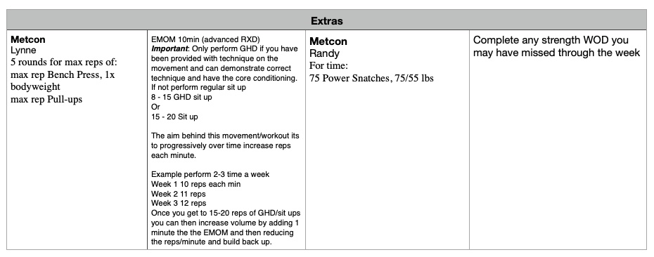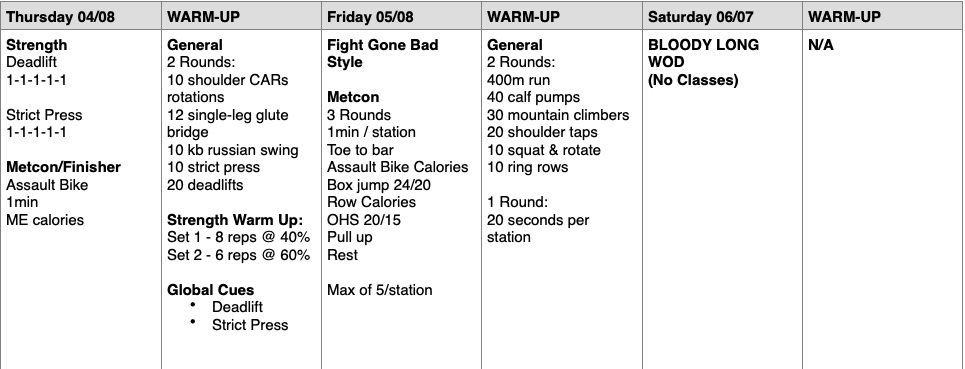WEEKLY PROGRAMMING (TESTING AND BLW) July 30, 2022July 27, 2022 by Adm1n_Acc3ss, posted in Uncategorized We hit our 1RM’s this week and finish the week off with BLW. Reminder Saturday class will not be on as BLW will be taking place. There is no extra’s programming this week. IF you miss a 1RM strength test be sure to make up for it in your own time during open gym.