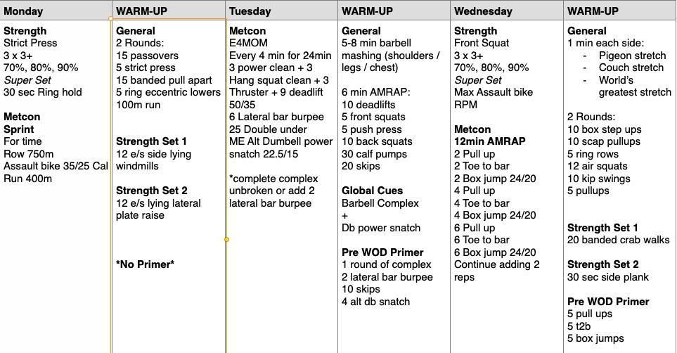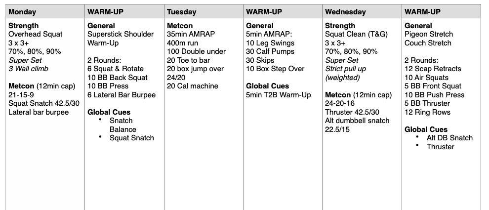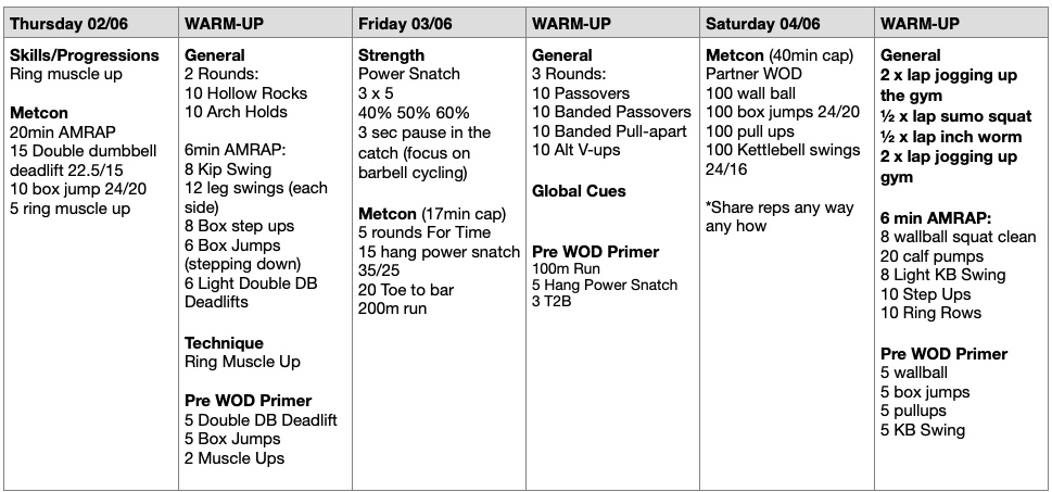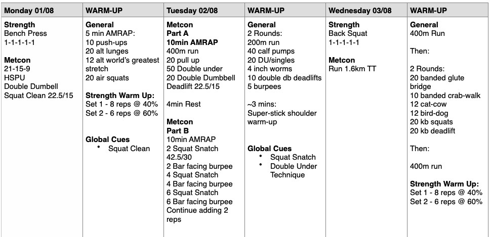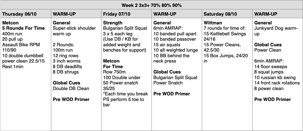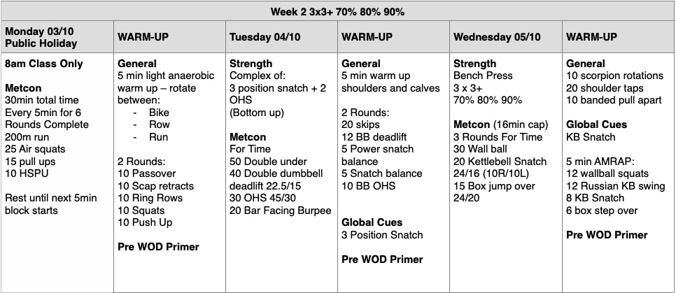 Weekly Programming October 1, 2022October 1, 2022 by Adm1n_Acc3ss, posted in Uncategorized Reminder Monday is a public holiday and we will run one 8am class. As always you will have 24/7 access to the gym. As we move into the 2nd week of our strength cycle we will also include a bench mark WOD. Enjoy!!!